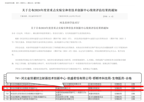 凯盛君恒“河北省预灌封注射器技术创新中心” 顺利通过2024年度绩效评估2025年7月28日,河北省科学技术厅公布了2024年度省重点实验室和省技术创新中心绩效评估的结果,凯盛君恒有限公司建设的“河北省预灌封注射器技术创新中心”顺利通过评估。
